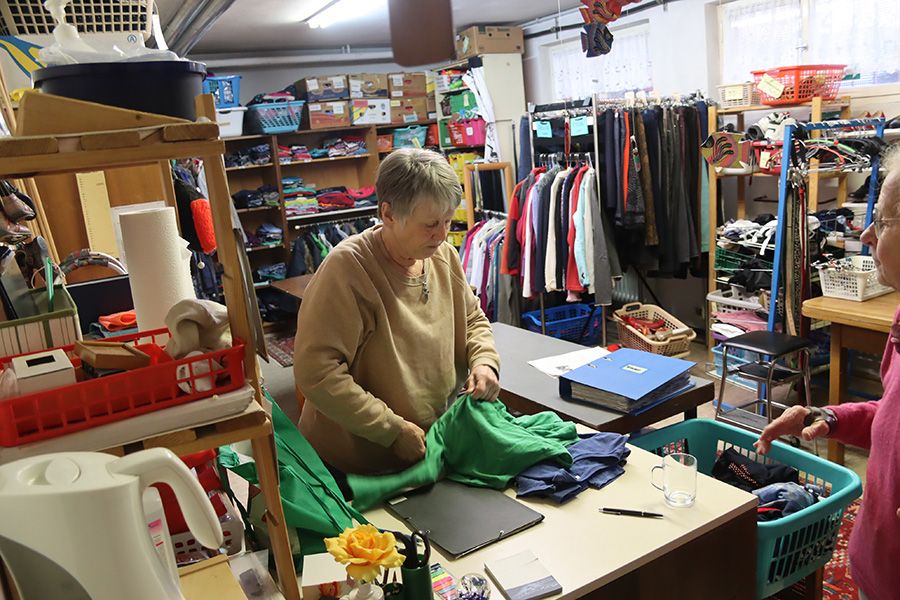 Die Gruppe ist größer geworden, aber auch nach 30 Jahren ist das Platzproblem geblieben. Dienstags wird Kleidung angenommen. Wer wann Kleidung bekommt, muss entsprechend geplant werden. So gibt es Nachmittage, an denen nur Männer nach Kleidungsstücke suchen können, an anderen Terminen sind die Räume für Frauensachen reserviert. Da aber die Kleidung der Frauen und der Kinder in einem Raum sind, kommt als zusätzliche Arbeit zwischen den Terminen das Umräumen der Kleidung dazu.
